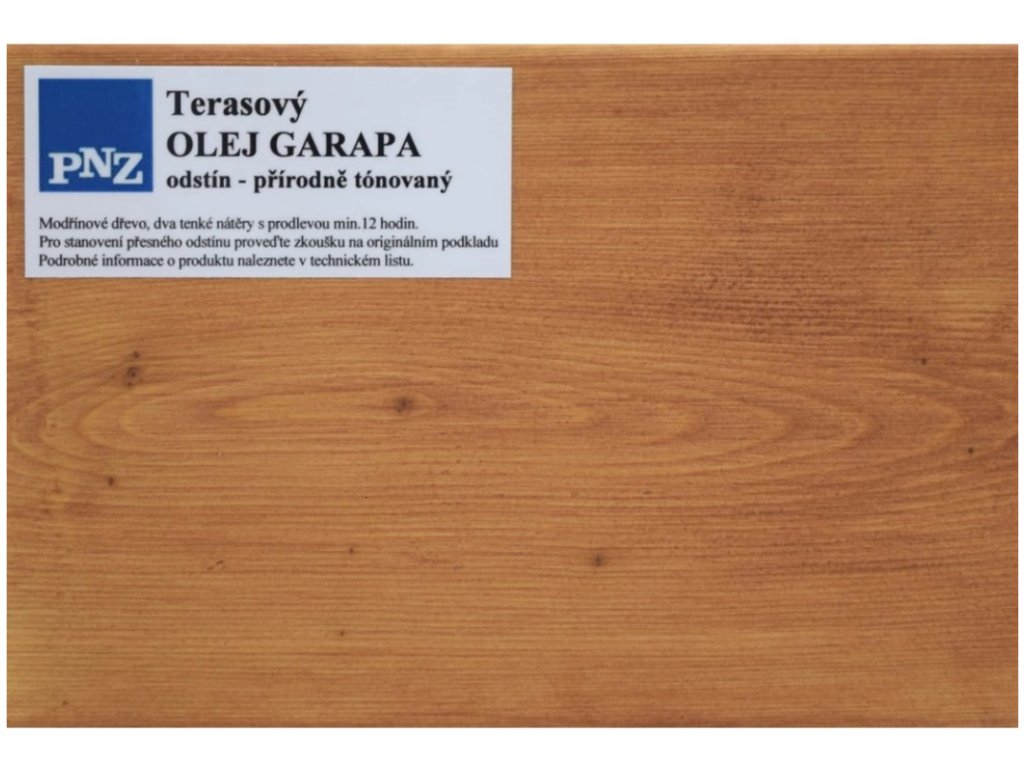 Garapa Öl - ošetření a ochrana dřevěných konstrukcí ve venkovním prostředí z exotických a dalších ušlechtilých dřevin, zejména z modřínu, jako je zahradní nábytek, terasy, pergoly, ploty, přístřešky pro auta, sruby a zahradní domky. Vyroben z přírodních olejů. Povrch je obnovován v přirozeném odstínu dřeva. Neobsahuje zdraví škodlivé látky, vytváří sametově matnou plochu.