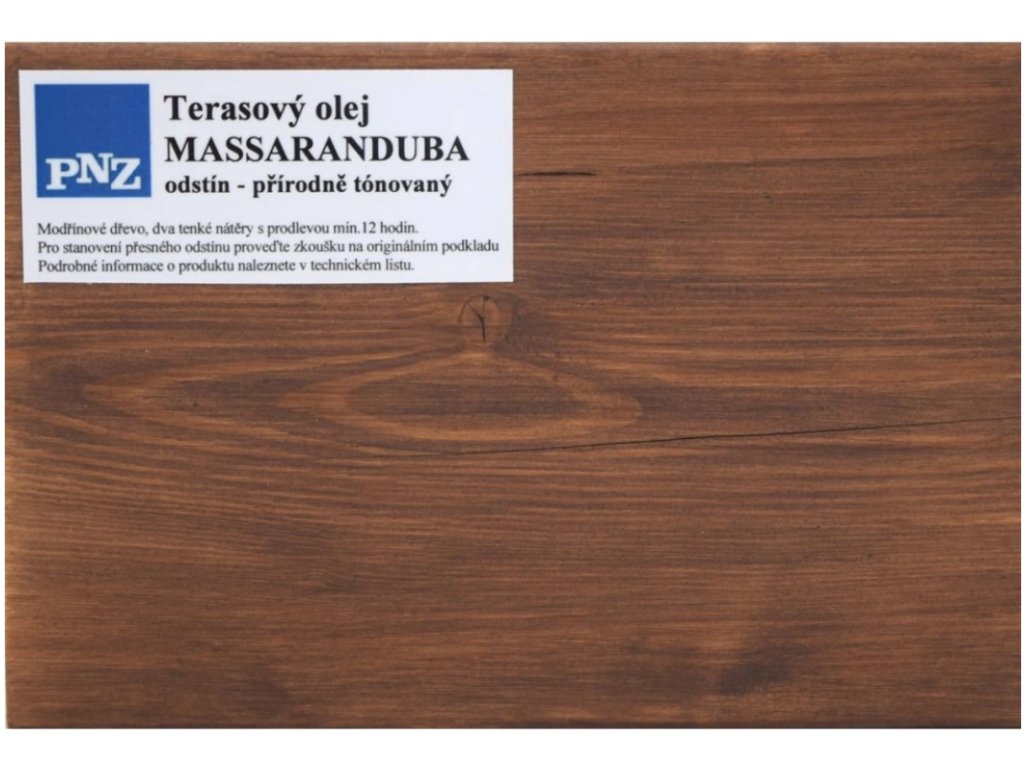 Massaranduba-Öl - ošetření a ochrana dřevěných konstrukcí ve venkovním prostředí z exotických a dalších ušlechtilých dřevin, zejména z modřínu, jako je zahradní nábytek, terasy, pergoly, ploty, přístřešky pro auta, sruby a zahradní domky. Vyroben z přírodních olejů. Povrch je obnovován v přirozeném odstínu dřeva. Neobsahuje zdraví škodlivé látky, vytváří sametově matnou plochu.